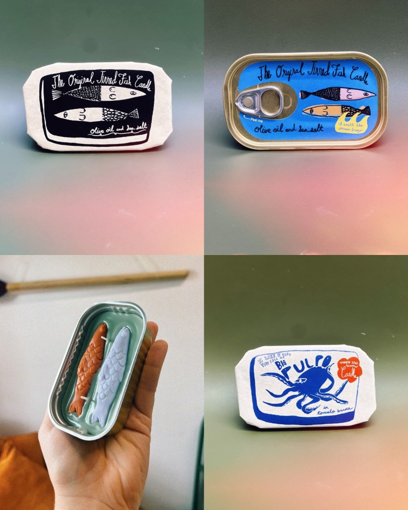 A handmade gift for the tinned fish lovers in your life, each one hand-poured, hand-sealed, and wrapped with care in their signature illustrated designs. It is a charming way to support a small artist run business while gifting something fun, clever, and guaranteed to get a smile.